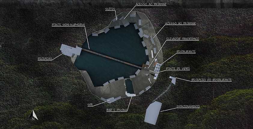 O CRÁTER HOTEL está incrustrado perimetralmente numa cratera de paredões com mais de 90m de altura e 95m diâmetro,